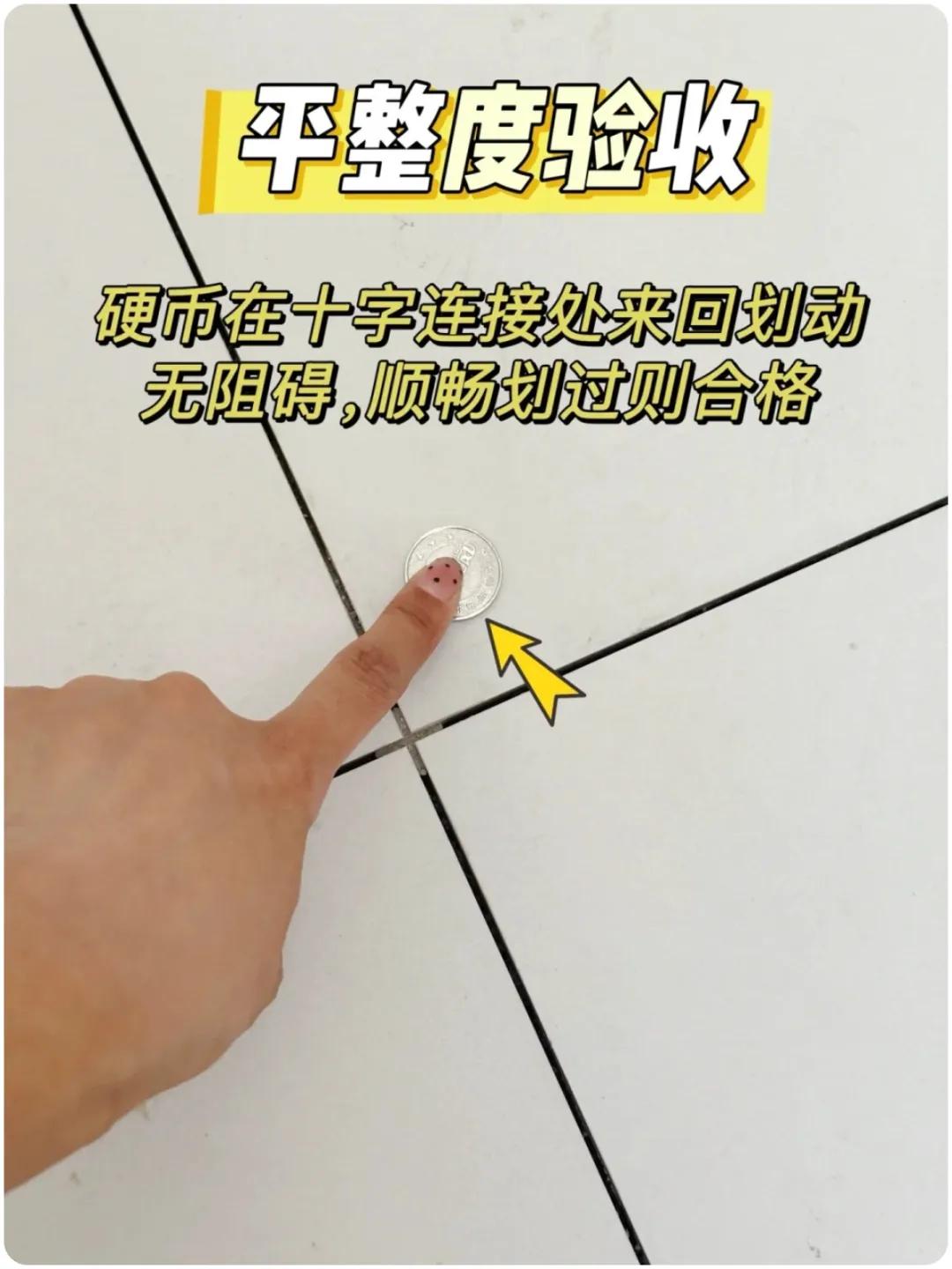 ▲平整度主要就是瓷砖十字交叉处,有没有凹凸不平,可以用硬币来回划动,顺畅滑行则可。