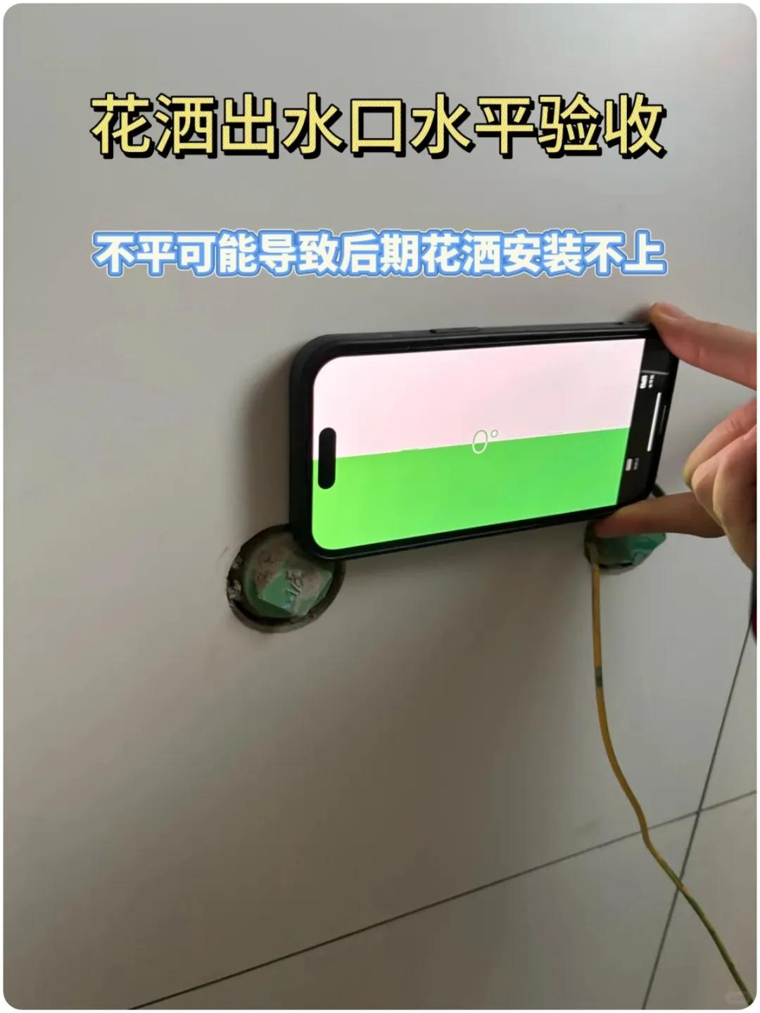 ▲花洒出水口水平验收很重要,冷热水整体配件情况下,也会有高低差,不平的话可能导致后期花洒安装不上。