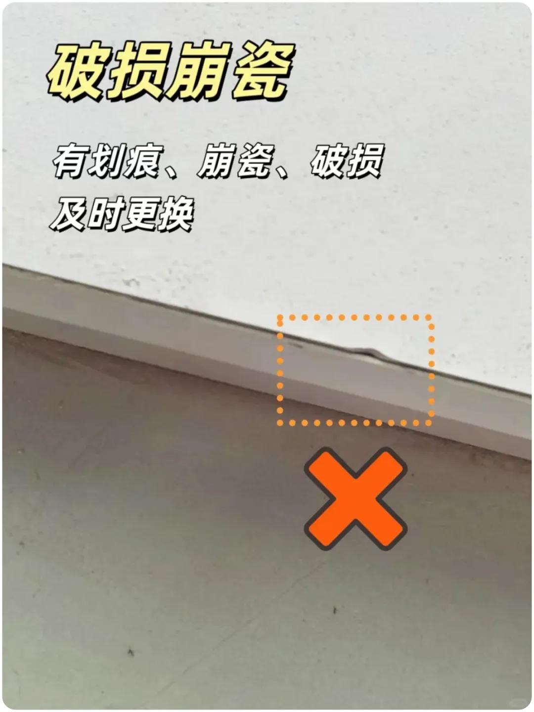 ▲瓷砖崩瓷非常常见,常见于阳角处,有定制柜挡住地方还能说得过去,无遮无挡的必须拆除重贴,美缝是收不好的。