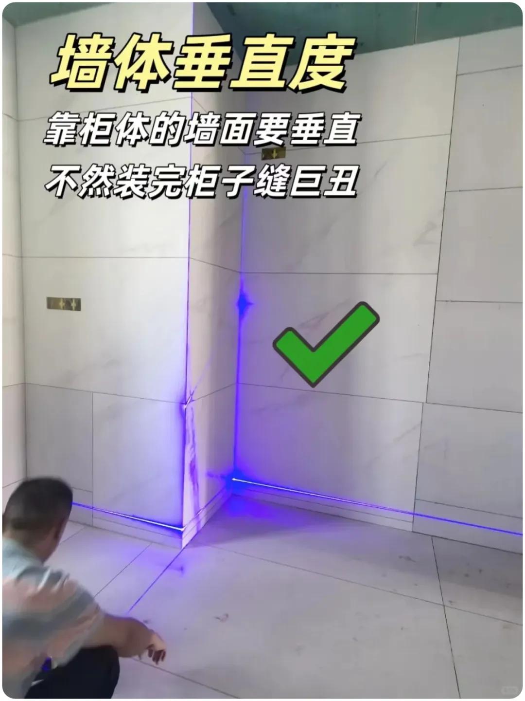 ▲挨个检查阴角是否90°,误差不超过2mm,这会涉及是到后期是否要加挡水条和柜体之间闪缝问题。