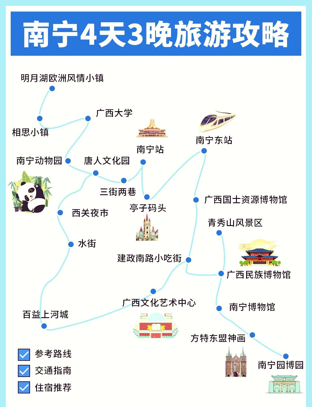 3. 美食:南宁的特色美食有“老友粉”(酸辣开胃)、“烤乳猪”(皮脆肉嫩)、“东盟菜”(越南春卷、泰国咖喱鸡),推荐“舒记老友粉”(金湖店)、“复记老友粉”(中山路)、“越南街”(青秀路)。