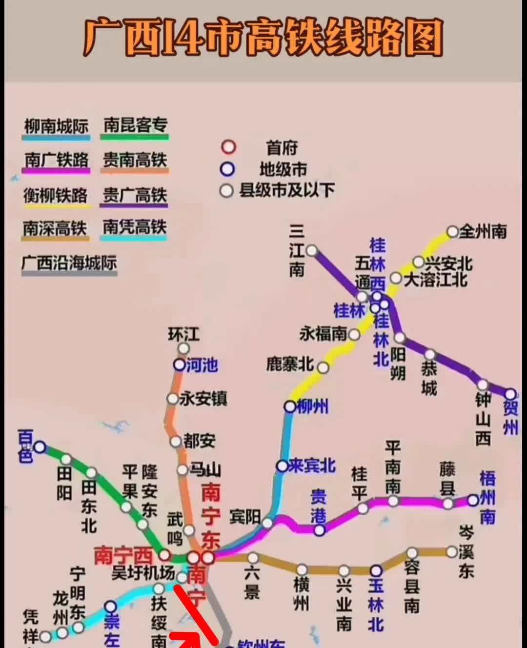 建设南钦城际铁路:连接南宁东站与钦州,设计时速250公里/小时,实现南宁→钦州20分钟直达。