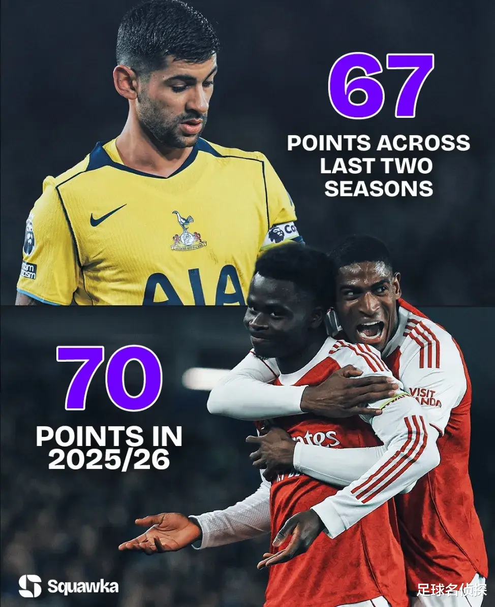 Squawka统计,战胜埃弗顿之后,阿森纳本赛季英超积分达到70分,比热刺最近两个赛季的积分总和还多!