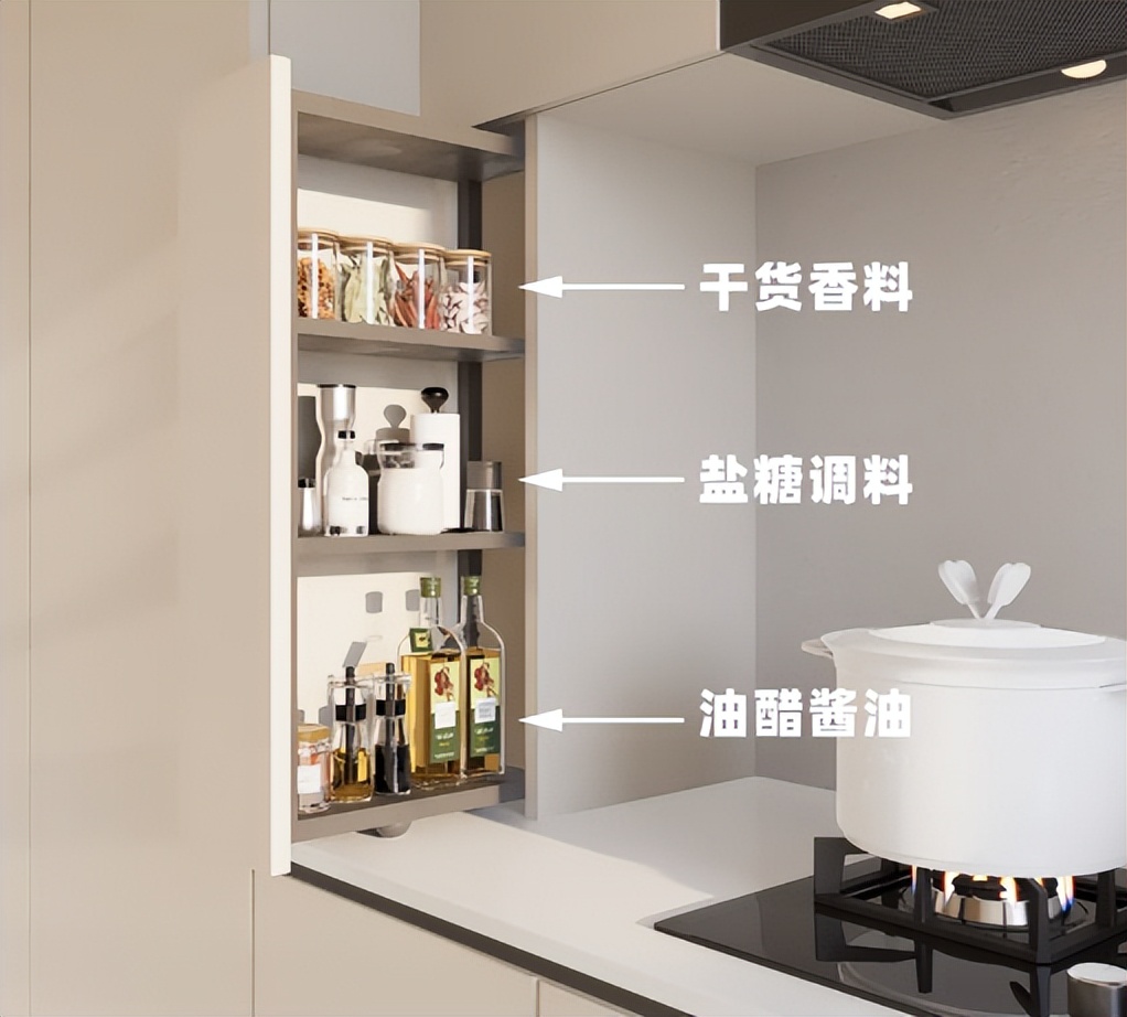 厨房的调料收纳一直都是让人比较烦恼的地方,如果都直接放在台面上,给人一种杂乱的感觉,而放在吊柜中用着也不是特别的方便,如果你也有这个问题,给大家最简单的解决方法,那就是靠墙的地方设计一个薄柜,收纳更轻松。