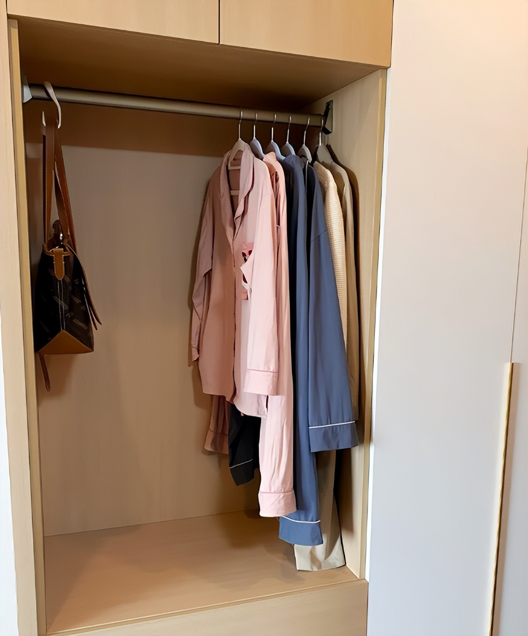 所以,如果你家正在设计柜子,可以跟婆婆学一学,在定制衣柜的时候,可以做一个次净挂衣区,将其设计在衣柜最边上的就可以了。