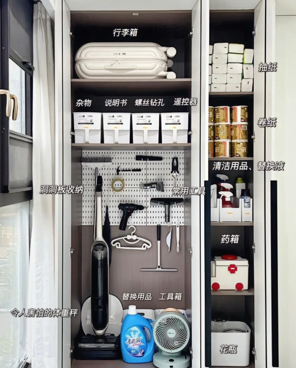 婆婆家的这个家政柜是很好用的,里面的容量很大,搭配着洞洞板能收纳不少东西,真方便。