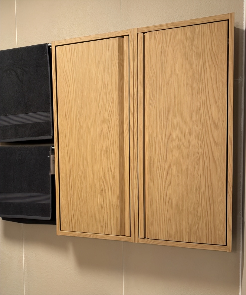 我家当时装修的时候就多亏了婆婆的提醒,定制柜子的时候,在马桶上面设计了一个原木的薄柜,看似美观不说,还能提升使用体验,收纳不少物品。