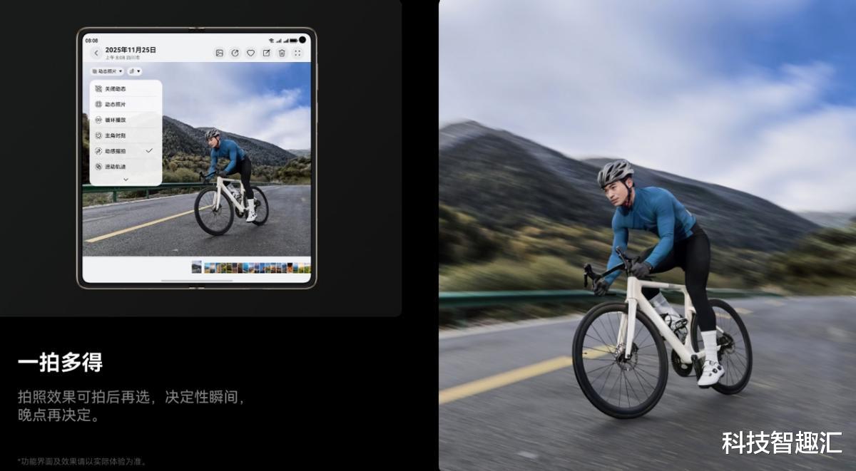 除了硬核的参数之外,华为Mate X7在影像玩法上也十分丰富。借助“一拍多得”,用户只需拍一张照片,后期就可以随意切换成闪拍、人像虚化、动感摇拍或动态照片等效果,再也不用因为选择模式而错过精彩瞬间。