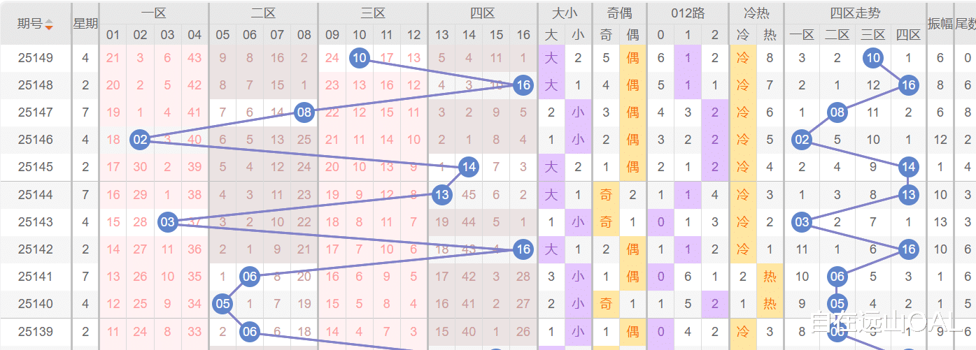 连号与重复号:过去10期内,连号现象(如148期的09-10,146期的26-28)出现频率较高,且上期开出的号码在下期重复出现的概率维持在20%左右,如148期的“15”在149期未出,但“04”从147期延续至149期(路径:147期05→148期04、09→149期04)。
