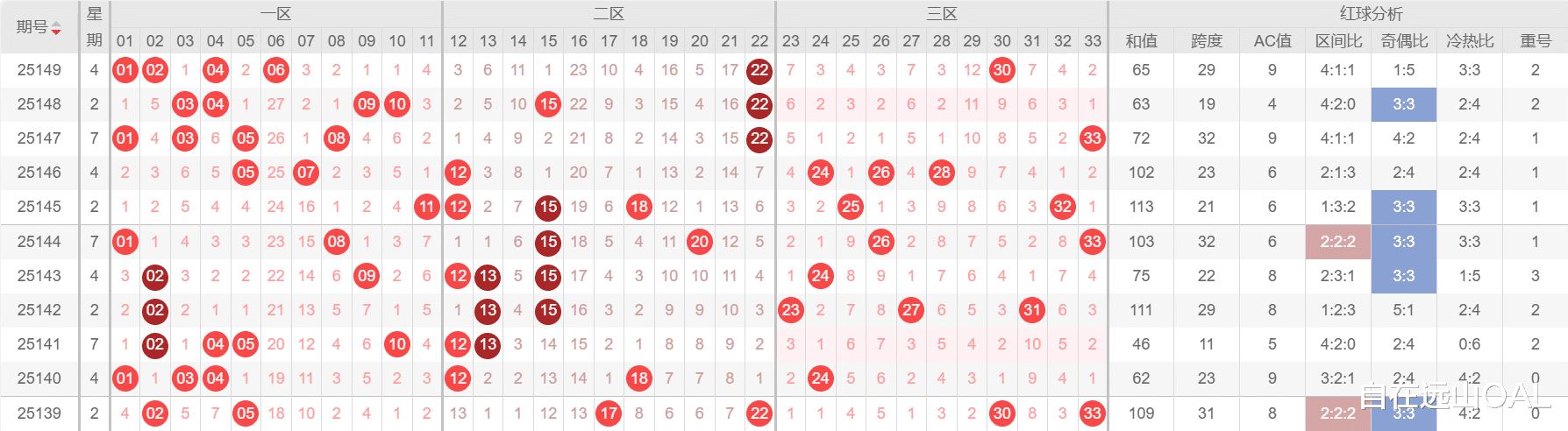 重点提防大号区回暖:近期三区出号略有减弱,但历史数据表明,在连续小号强势后,大号区(特别是25-33)极易迎来反弹。号码29、31、33值得重点关注。