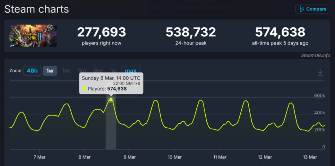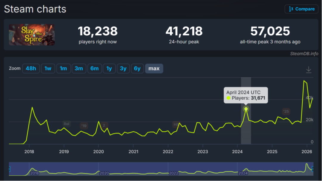 像前不久因EA测试在Steam爆火的《杀戮尖塔2》,如果你去了解其经典前作《杀戮尖塔》的Steam数据就会发现,从2018年开始到如今近八年时间,其日常在线长期稳定在1-2万区间,仿佛也在印证这类玩法的“小众硬核”。然而,其续作《杀戮尖塔2》这次的爆发,则是刷新了市场对这个品类的认知。短短数天就一路突破至57万日活,足以看到这个品类的市场潜力,卡牌构筑玩法也许并非想象中的那么小众,也开始被更多玩家所接受。