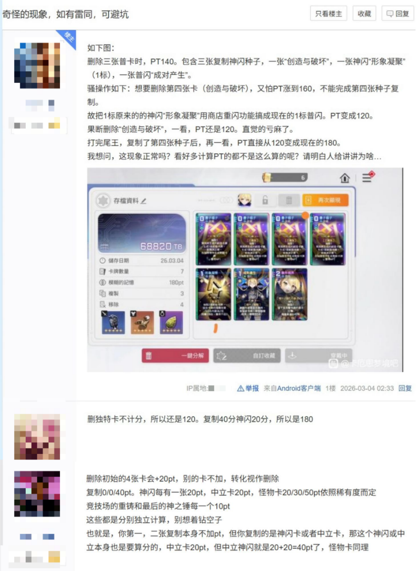 而随着发展,越来越多的玩家在百度贴吧、NGA、B站等平台上讨论卡牌构筑,计算极限伤害、分析角色buff收益,为了达到理论的卡组最优配队讨论不止,乐此不疲。其中不仅因为卡牌构筑玩法的魅力,还源自《卡厄思梦境》存在不少自身的内容创新带出大量玩法信息,赋予了局后总结、游戏外讨论的同等必要性。