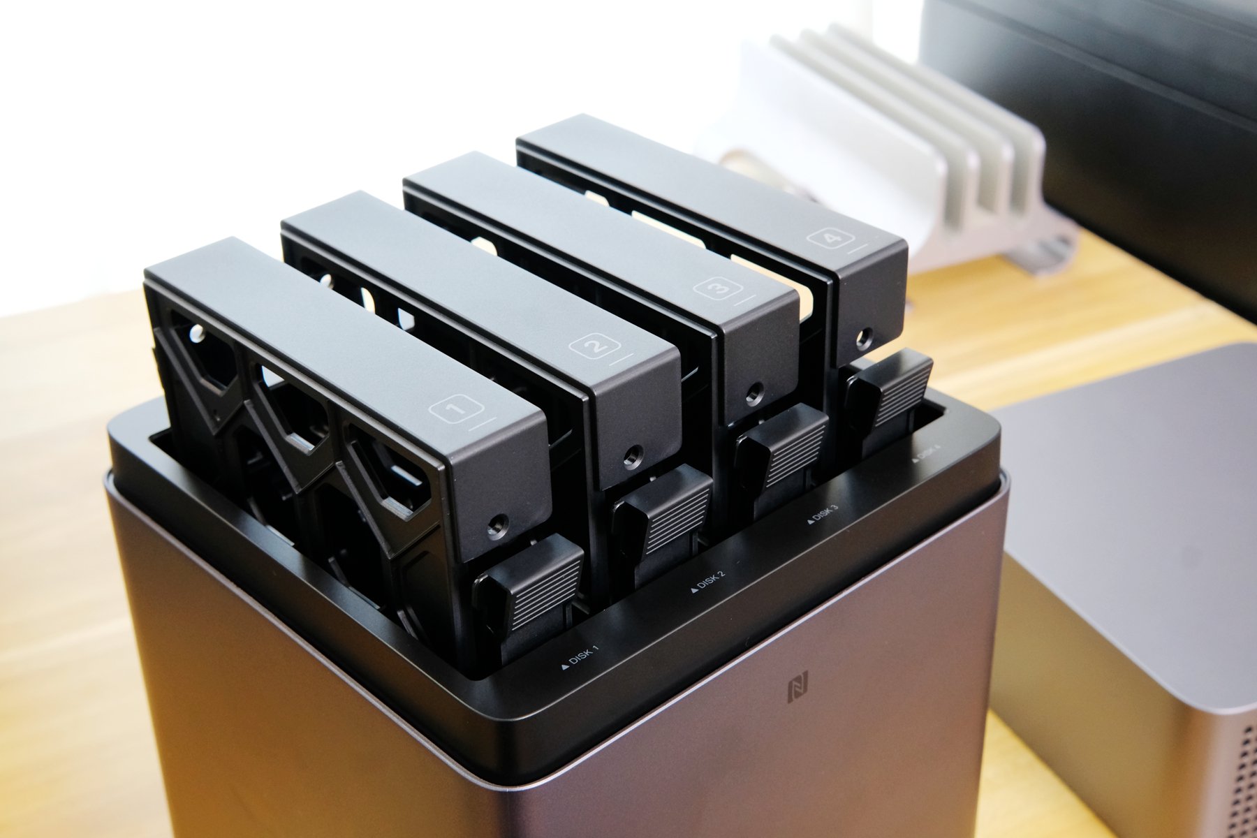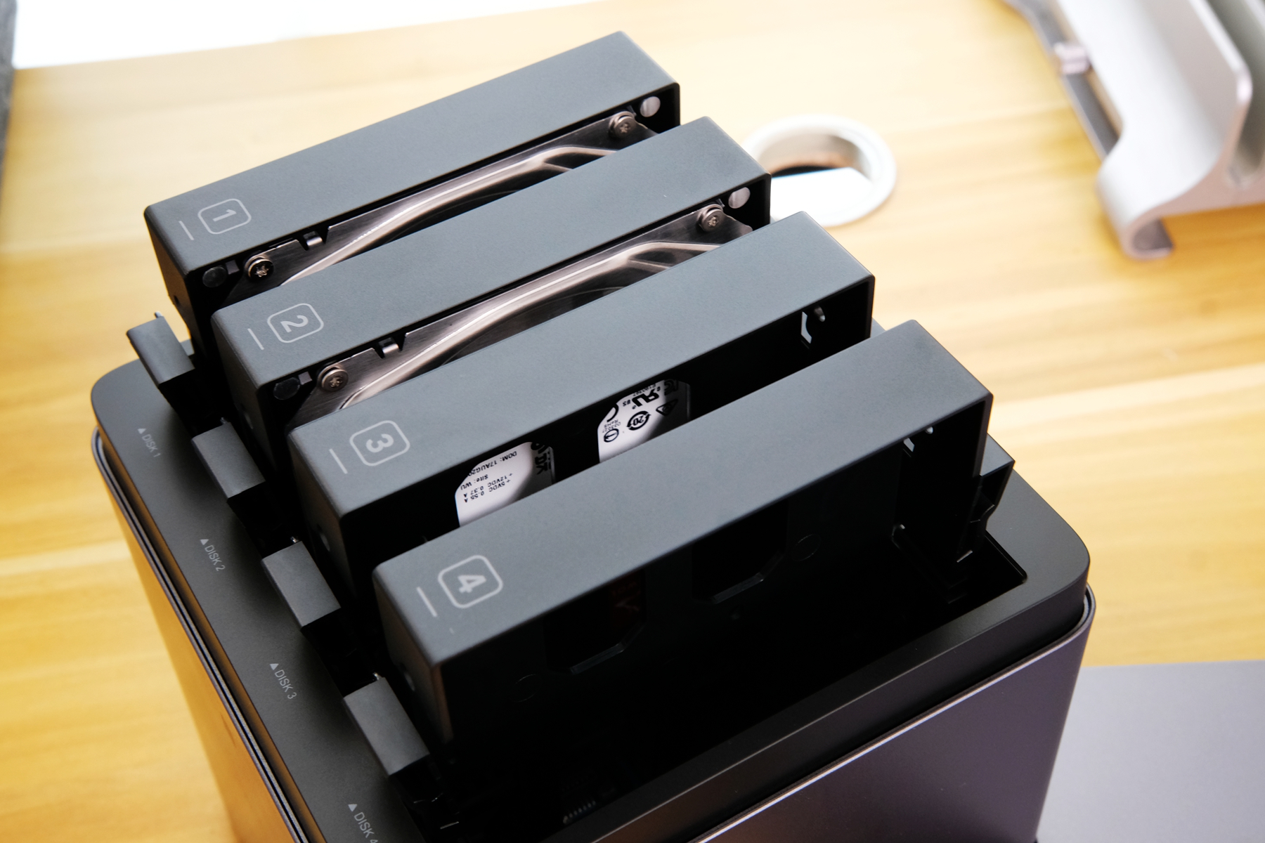 打开绿联DH4300 Plus磁吸式上开盖,就能看见4个硬盘架了。