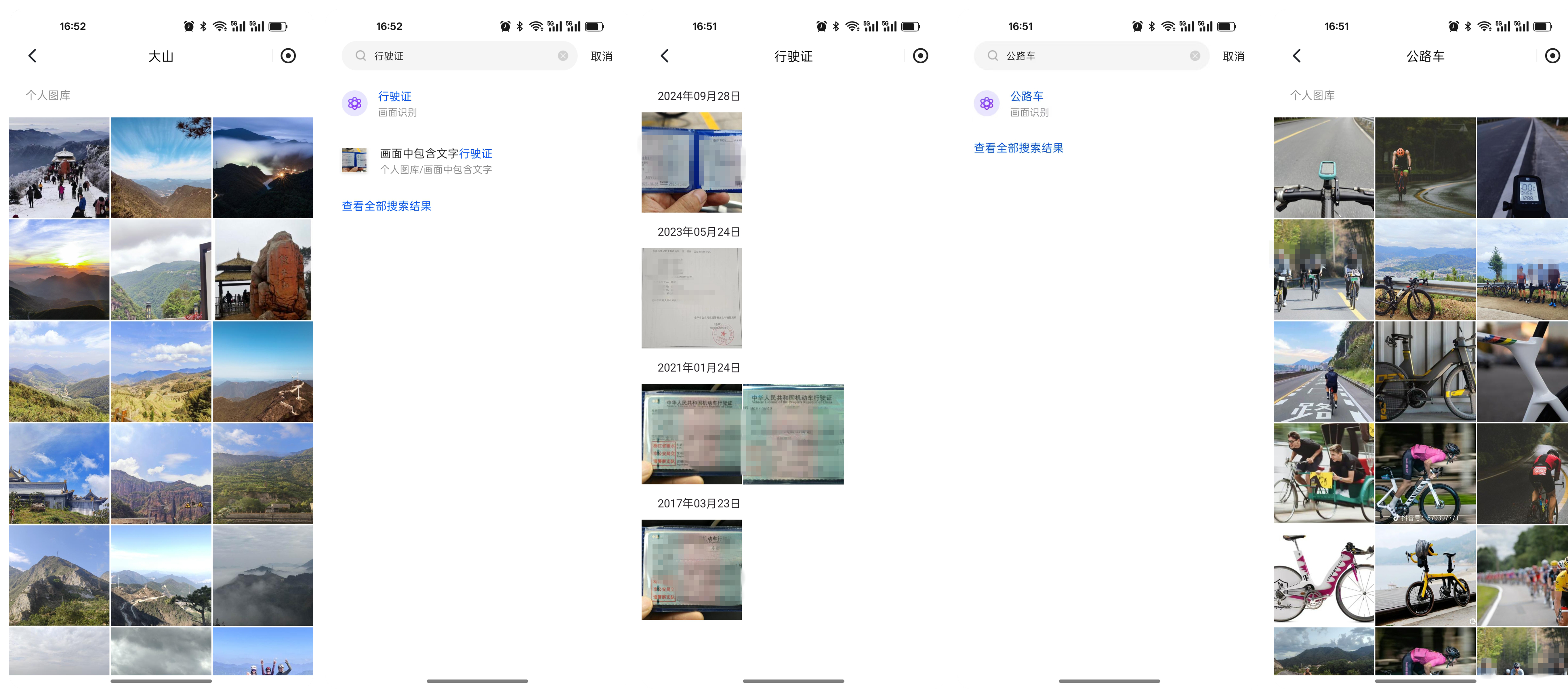 还可以根据照片中的主题来寻找,例如“大山”,就能找出我们所有拍“山”的照片,用“公路车”就能找出各种骑车时候的照片,AI甚至还能快速识别照片中的文字,我用“行驶证”关键字,绿联DH4300 Plus甚至一下子把我8年前拍的行驶证照片都找出来了,绿联能够利用NPU来加速进行照片库的管理,对于照片内容和场景的智能识别能力又强又快,用起来十分舒爽。