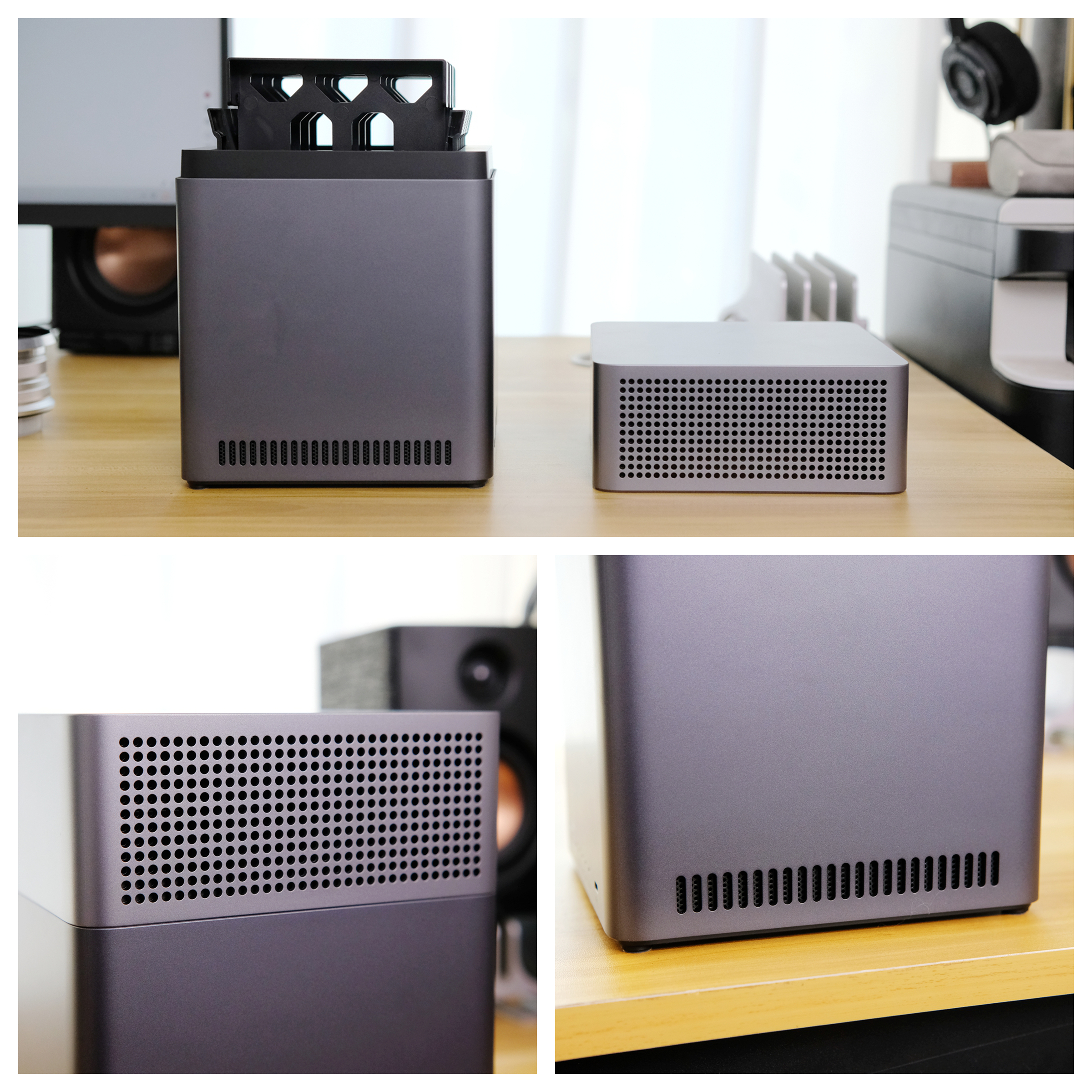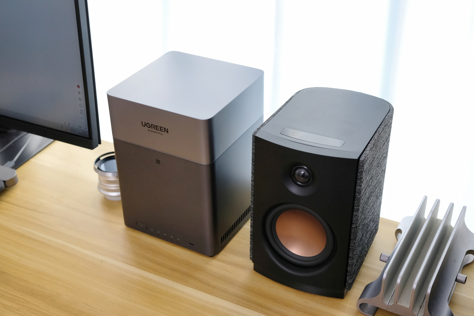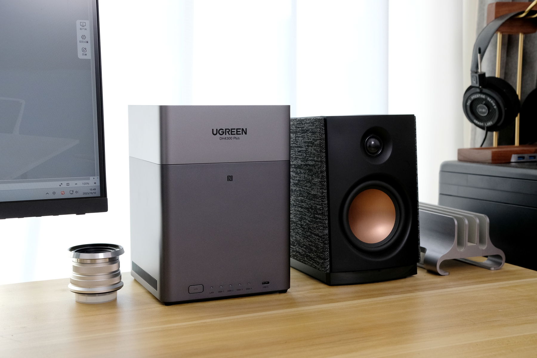 作为4盘位的NAS,绿联DH4300 Plus体积和我的多媒体音箱差不多大小,无论是摆在电脑桌还是电视柜,都不占地方显得精巧可爱。