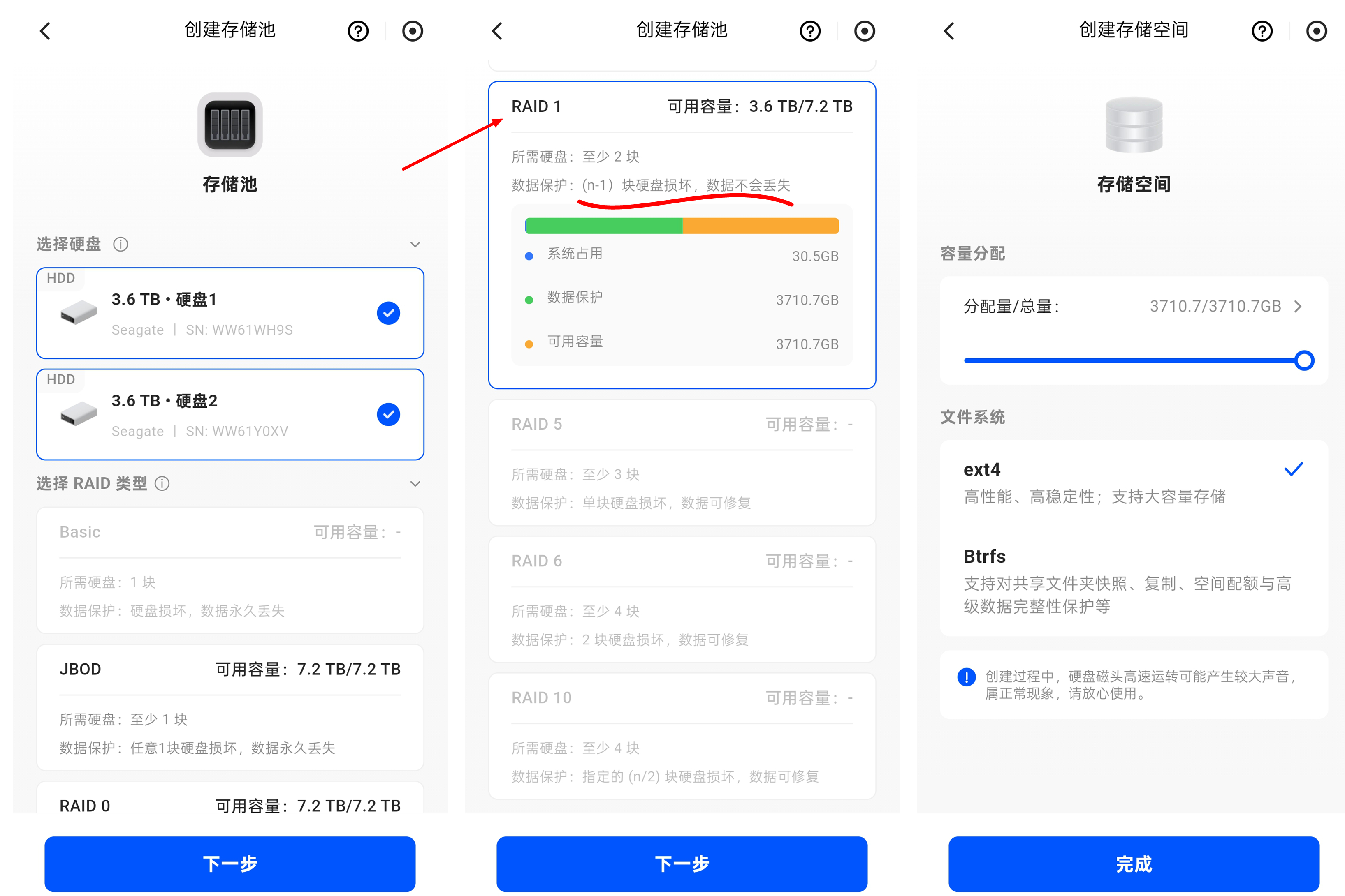 在选择硬盘阵列的时候,双盘系统我建议是选择稳妥的RAID1模式,就算是其中一块硬盘坏了,也不会导致我们丢失宝贵的数据。
