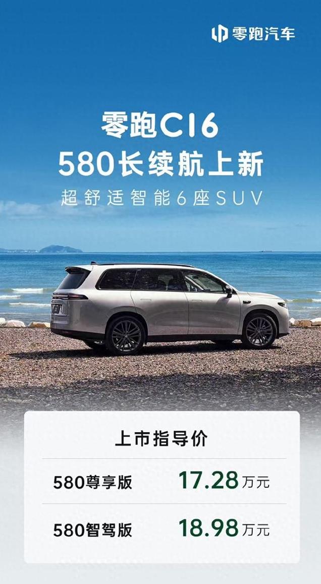 日前,零跑汽车官方宣布,零跑C16 580长续航版正式上市,共推出2款车型,其中580尊享版的官方指导价为17.28万元,580智驾版的官方指导价为18.98万元。作为全新续航车型,新车配备容量更大的磷酸铁锂电池组,CLTC工况纯电续航里程为580公里。现阶段,零跑C16纯电版本还可选520公里续航车型。