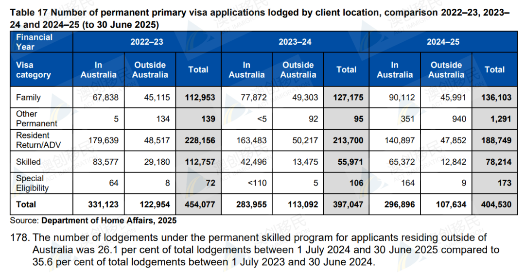 在24-25财年,除居民返程签和ADV签证外,全部澳洲其他移民类签证的申请量全部上升。
