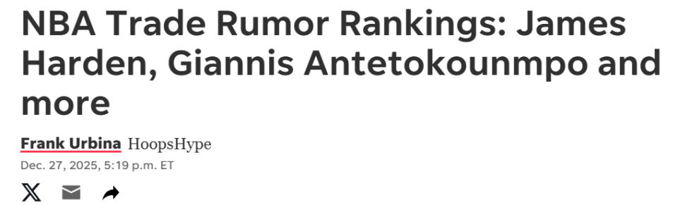 《Stein Substack》也给出相同说法,并且进一步确认数支球队都在等待快船队战绩进一步恶化后将哈登摆上货架。