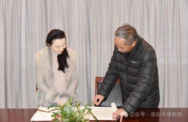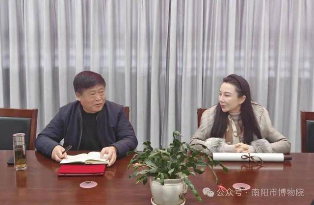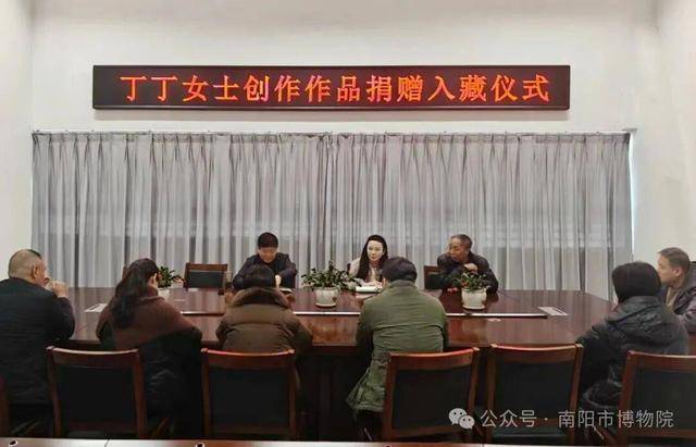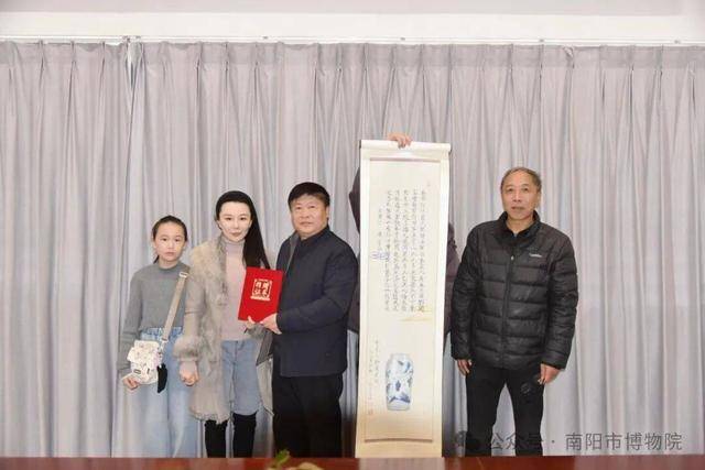 12月16日,书画家丁丁携女常若丁专程从西安来到南阳市博物院,捐赠其精心创作的书画作品《青花人物图瓷瓶立轴》。南阳市博物院院长牛宏成、副院长尹俊敏参加。牛宏成院长向其颁发收藏证书,感谢她对南阳文博事业的关注和支持。