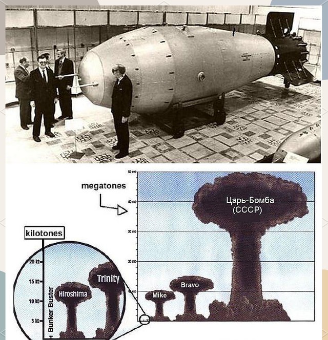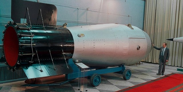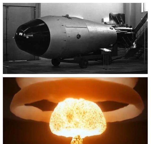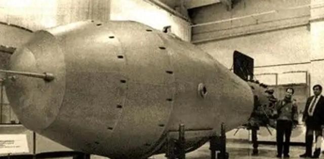 苏联科学家团队由著名核物理学家萨哈罗夫领衔,仅用14周就完成了,这枚炸弹长8米,直径2.1米,重量达27吨,相当于三辆主战坦克的重量。