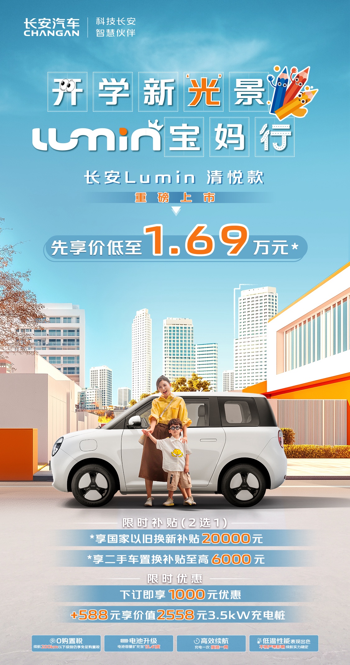 9月1日,正值开学迎新季,国民出行精品车——长安Lumin系列再添新成员,长安Lumin清悦款诚意上市,先享价低至1.69万元,助您稳赢新学年。新车在延续一贯品质安全优势的同时,对电池电芯技术进行扩容升级,并且满足国家技术标准,可享购置税减免政策,为广大年轻用户带来超值的出行体验。与此同时,长安Lumin还推出了丰富的购车权益,让高品质移动生活从此触手可及。
