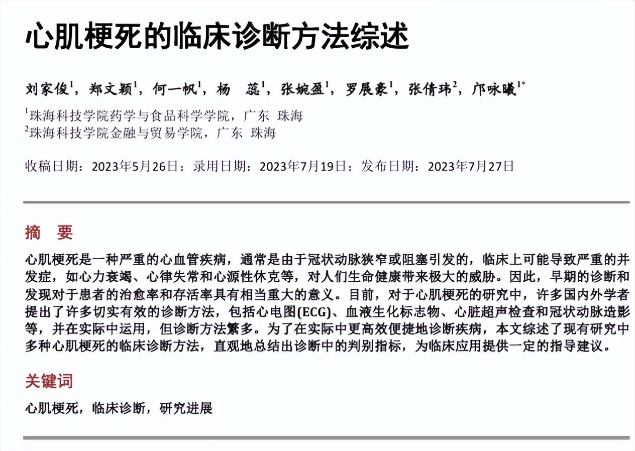 参考资料[1]刘家俊, 郑文颖, 何一帆, 杨蕊, 张婉盈, 罗展豪, 张倩玮, 邝咏曦. 心肌梗死的临床诊断方法综述[J]. 亚洲心脑血管病例研究, 2022, 10(4): 21-29.