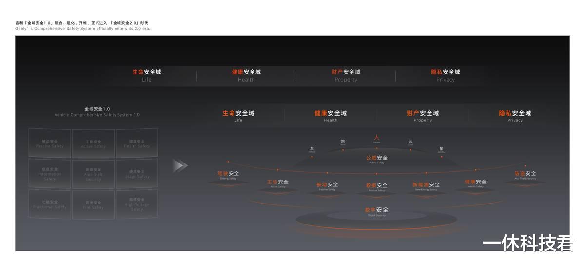 作为行业安全技术的先行者与引领者,吉利在“全域AI”技术体系的赋能下,以“AI为纲 责任为本”,基于原有的“全域安全”技术体系进阶打造“全域安全2.0”技术体系。结合智能时代的安全新需求和新挑战,“全域安全2.0”技术体系秉持“以人为尊”理念,通过技术升级、能力突破与范式创新,将侧重“整车安全”的视角升级为“人-车-路-云-星”的生态视角,旨在贯穿用户出行全场景、覆盖出行全领域、联动出行全生态;并以“生命零伤亡、健康零危害、财产零损失、隐私零泄露”四大安全愿景为指引,逐步构建的一套为消费者提供全面的安全保障技术体系。
