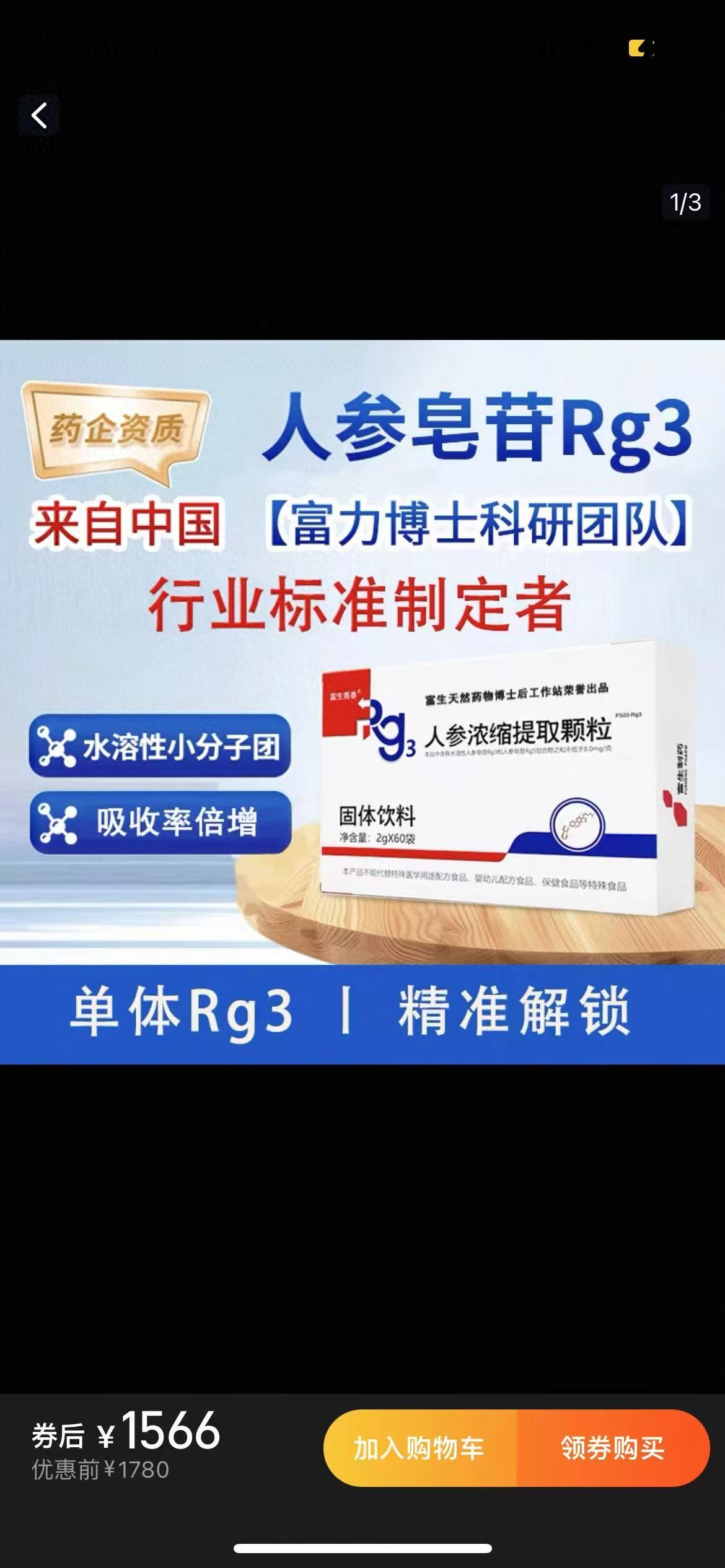 12月10日,记者发现,相关产品已重新上架,在产品的宣传页面中,商家删除了此前“中药一类单体创新药证书”及视频宣传等,保留了“企业创始人富力、鲁岐博士是‘水溶性人参皂苷Rg3发明人’‘参一胶囊发明人’”,国家中医药管理局颁发的突出贡献证书以及美国FDA二期批件等内容。