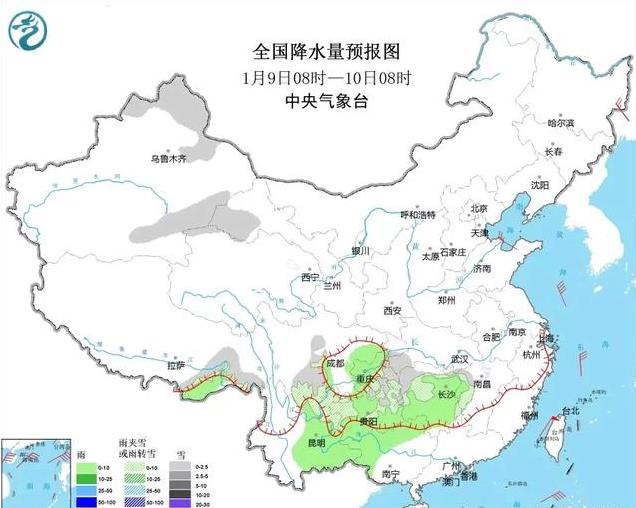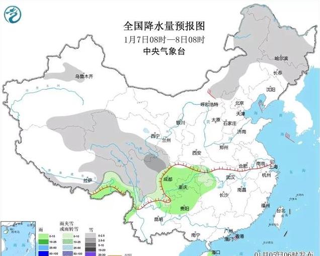 由于此时南方气温还较高,西南东部等地仍以降雨为主。四川盆地大部、贵州中北部、湖北西南部、湖南西北部、云南西北部和东北部以及西藏东南部等地部分地区有小雨,云南西北部和东北部、贵州西北部、湖北西部、湖南西北部、重庆东北部和西藏东南部等地部分高海拔地区有雨夹雪。