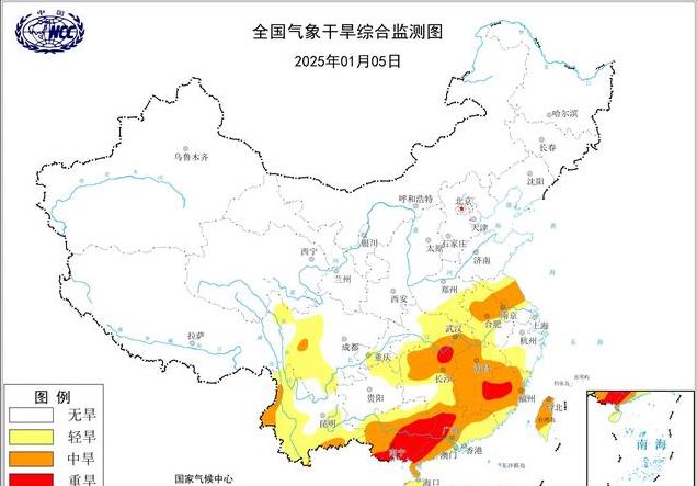 由于缺少有效降水,南方气象干旱持续发展扩大,部分地区旱情甚至进一步升级。对比今年1月5号和去年12月29号,江淮、江南和华南等地多地旱情已加剧,目前安徽江苏湖北湖南江西福建广西广东台湾等地出现了成片的中旱到重旱区域。