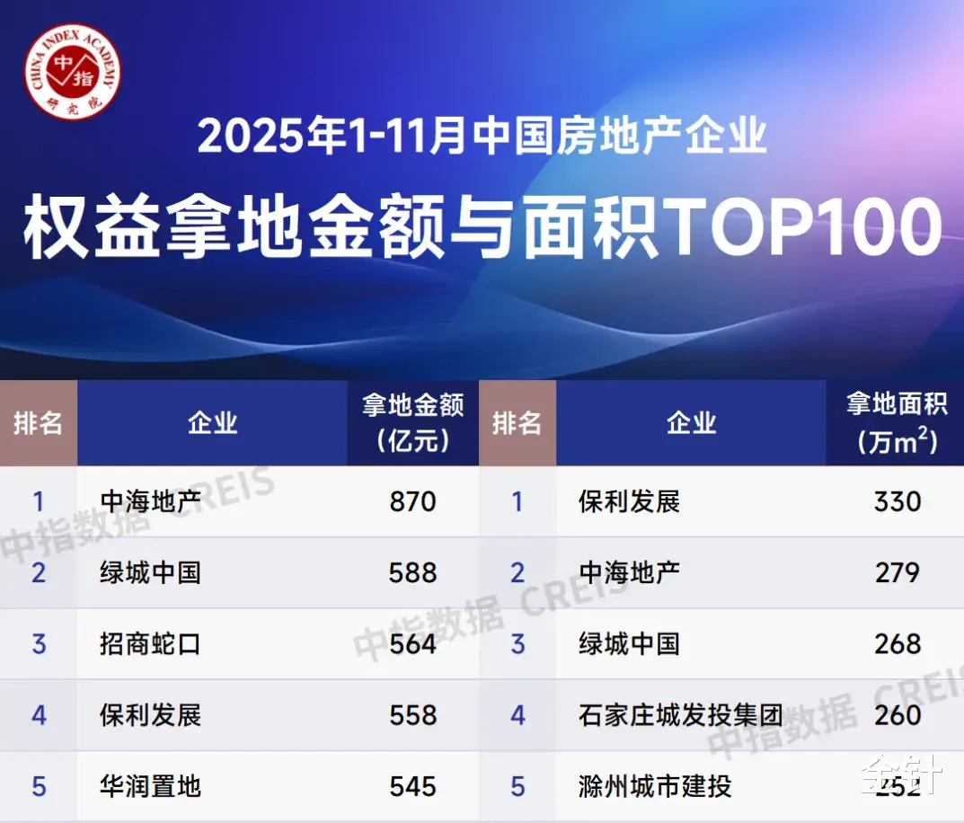 放眼全国,2025年1-11月,中海以870亿元位居百强房企拿地金额榜top1,且连续三年稳居“拿地王”宝座。