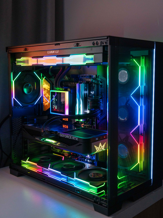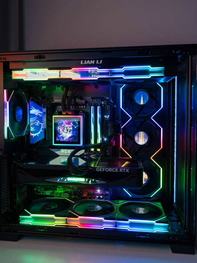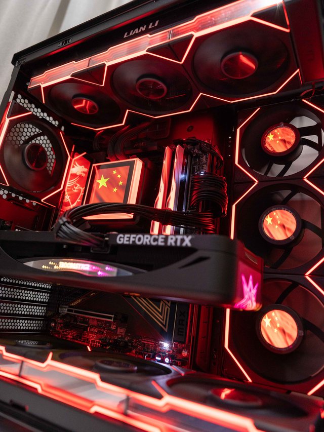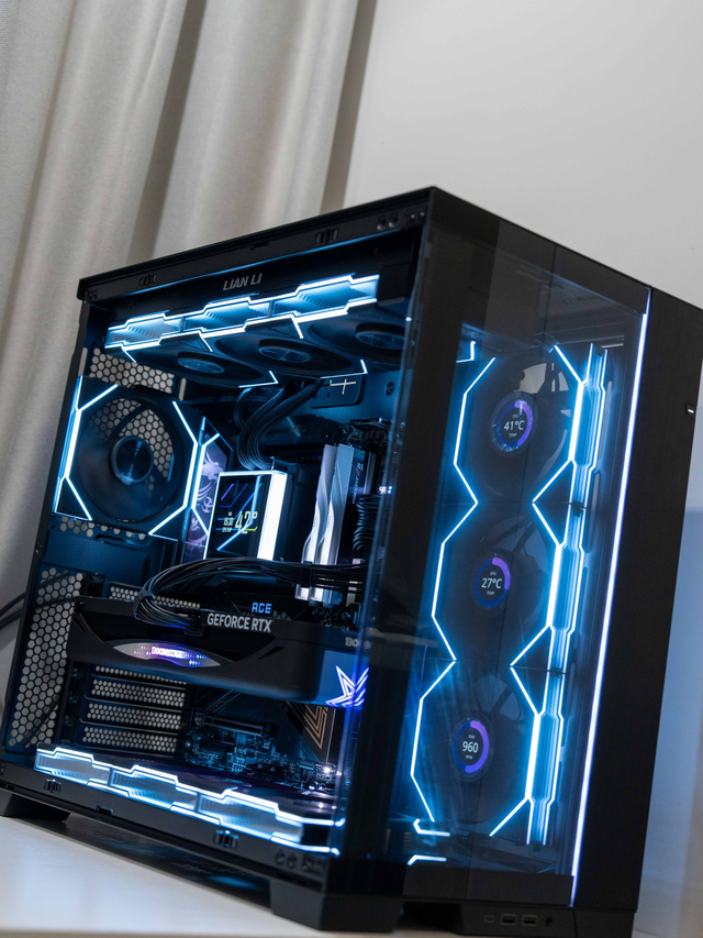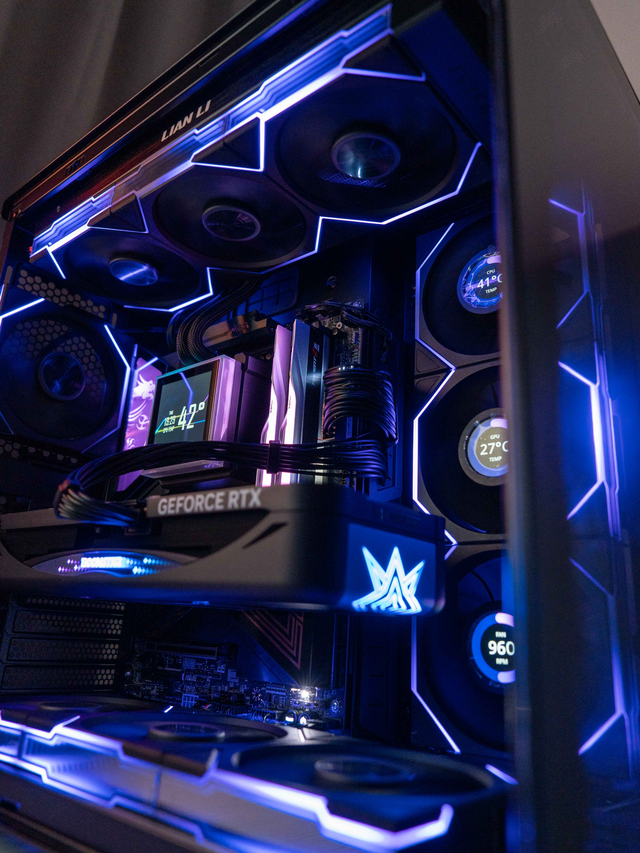 而在美学维度,联力隐流2代水冷的隐藏式走线、包豪斯O11D EVO机箱的无遮挡全景视野、以及积木风扇四代的无限镜灯效与无线互联,三者协同将光污染直接拉满,构造出一场有深度的光影交响诗。
