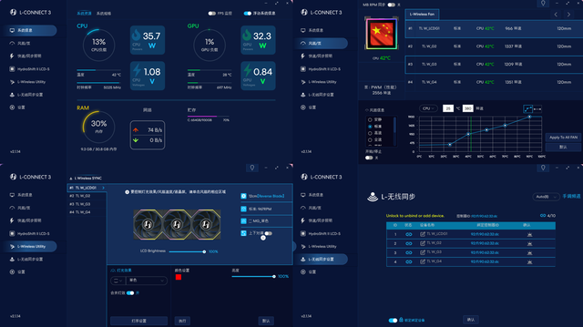 在风扇控制页面可以看到,联力隐流2代一体式水冷散热器 TL风扇版以及其余的联力积木风扇四代无线版都通过无线的方式成功连接,无论是监视还是控制都非常方便。