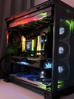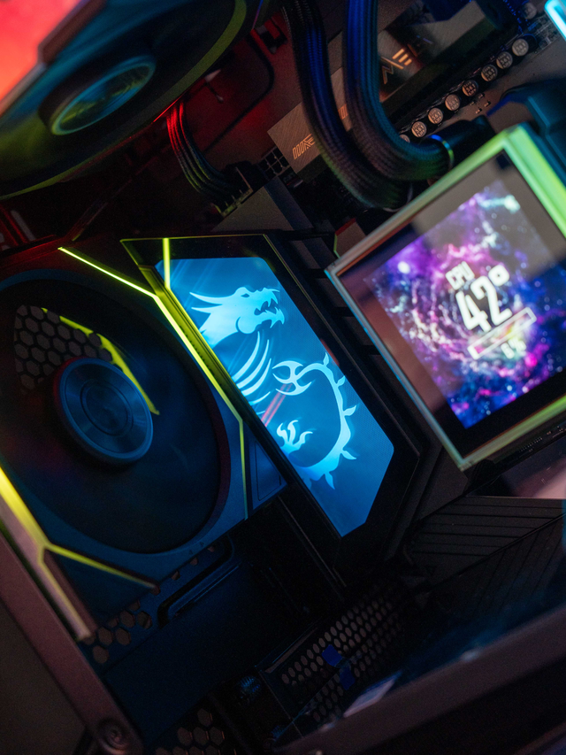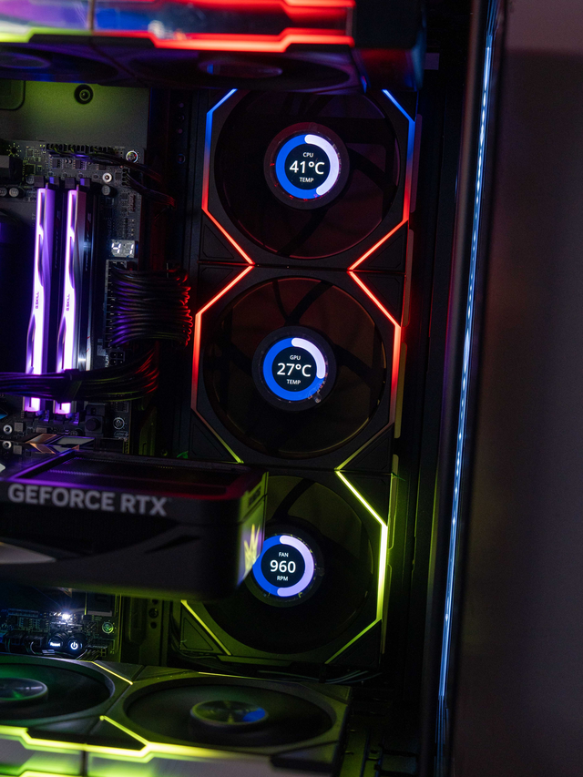 颜值方面简直拉满,其标志性的无限镜ARGB灯效系统,通过精妙的镜面反射原理,让光线在扇框侧边形成深邃无限、层层延伸的视觉奇迹,在这套纯黑海景房中,犹如将一片微缩的银河装入了机箱。