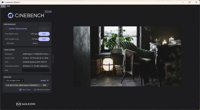 Cinebench 2024测试,单核137pts,全核1265pts,性能卓越。