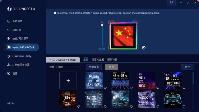 除了预设主题,还支持自定义展示,设置操作非常便捷。我把自己火红的中国心上传到软件里面,一键设置便直接点燃机箱。