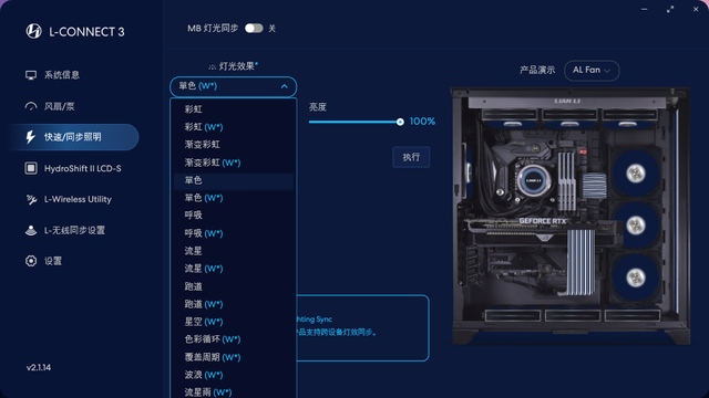 在灯效同步页面,联力提供了多种预设方案供用户选择,我实拍了两种渐变颜色给大家直观感受一下无限镜ARGB灯效系统的实力。