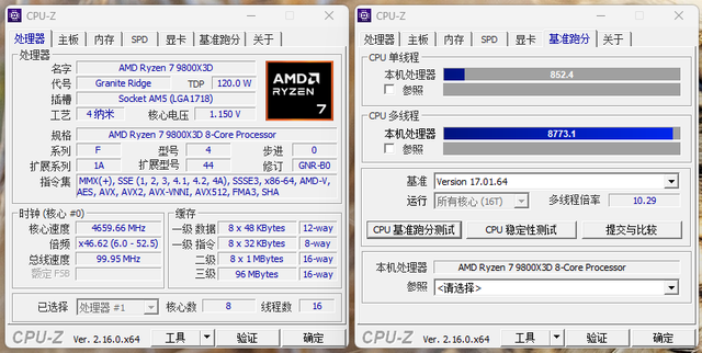 CPU-Z测试,9800X3D手动PBO设置下,单核852.4,全核8773.1,非常亮眼的成绩。