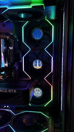 想要实现满机箱的光污染,还得加上联力的积木风扇,这套主机我配上了3种联力积木风扇四代LCD无线版:3把带屏黑色反叶放在侧面,跟水冷屏幕形成画面联动;3把反叶置于底部进风,还有1把正叶放在后背出风,形成高效气流通道。