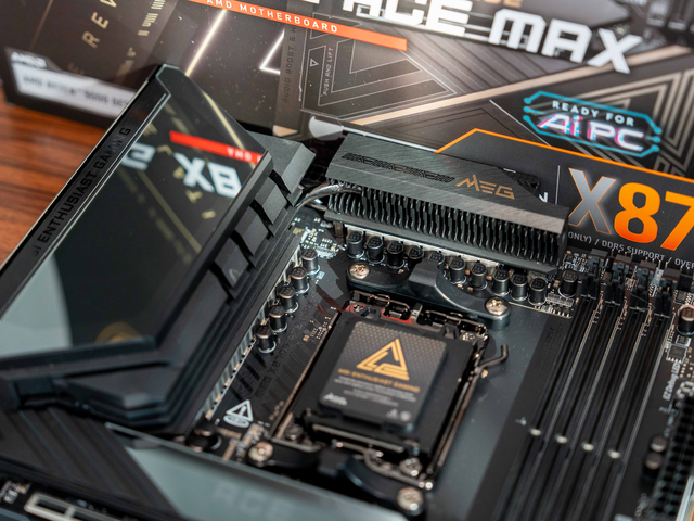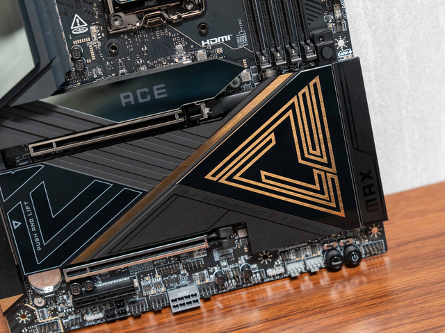 微星MEG X870E ACE MAX战神主板本体被大面积的黑色金属装甲覆盖,质感硬朗高级,龙纹Logo区域相比前代进一步扩大,配合金属背板,尽显旗舰风范。