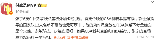 媒体人付政浩发文点评:“张宁6投0中仅得1分2篮板外加4次犯规。看完今晚的CBA新赛季揭幕战,郭士强指导的国家队12人名单不带他也无可厚非,他的动作尺度放在FIBA体系下考量确实是个灾难。多练球技、少练连招吧,如果CBA裁判真的和FIBA接轨,张宁的赛场威力起码打一半折扣。”