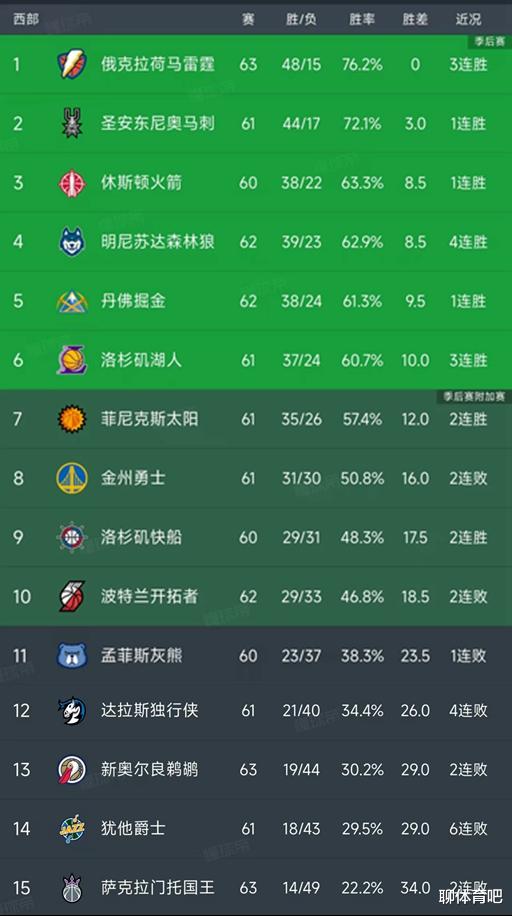 北京时间3月4日,随着湖人110-101鹈鹕、太阳114-103国王的比赛结束,今天的NBA常规赛结束了所有比赛,我们看看西部最新排名!