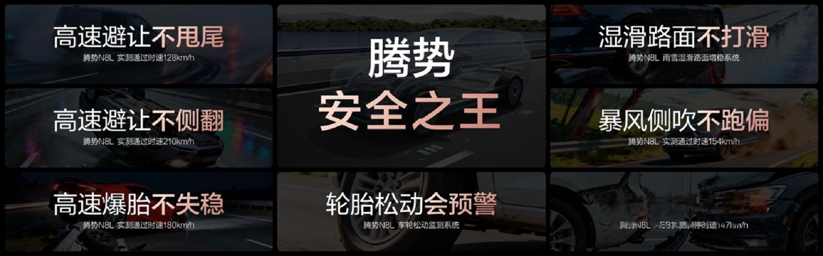 主动安全方面,得益于易三方,腾势N8L能够以128km/h高速避让不甩尾、210km/h高速避让(鱼钩测试)不侧翻、180km/h高速爆胎不失稳、154km/h暴风侧吹不跑偏、147km/h AEB自动紧急制动、不怕雨雪路面打滑、车轮松动监测系统,以科技安全守护家人出行安心。腾势汽车不愧被称为新能源汽车的“安全之王”。