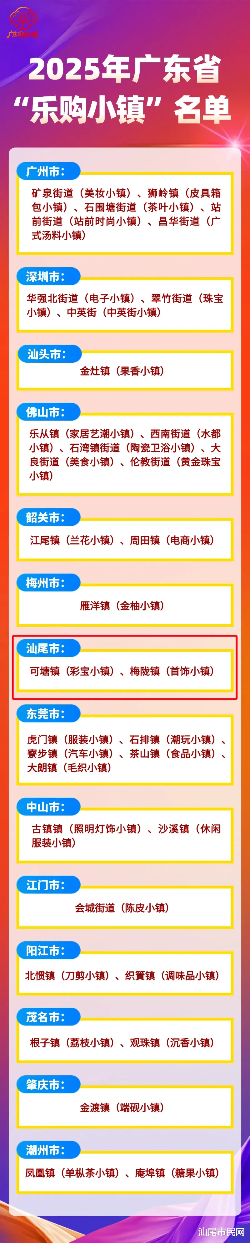 12月12日,广东省商务厅发布2025年广东省“乐购小镇”名单,全省共有34个镇(街)入选。我市海丰县可塘镇、梅陇镇凭借特色产业优势成功跻身名单。