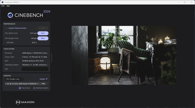 Cinebench 2024测试,单核140pts,全核1241pts。