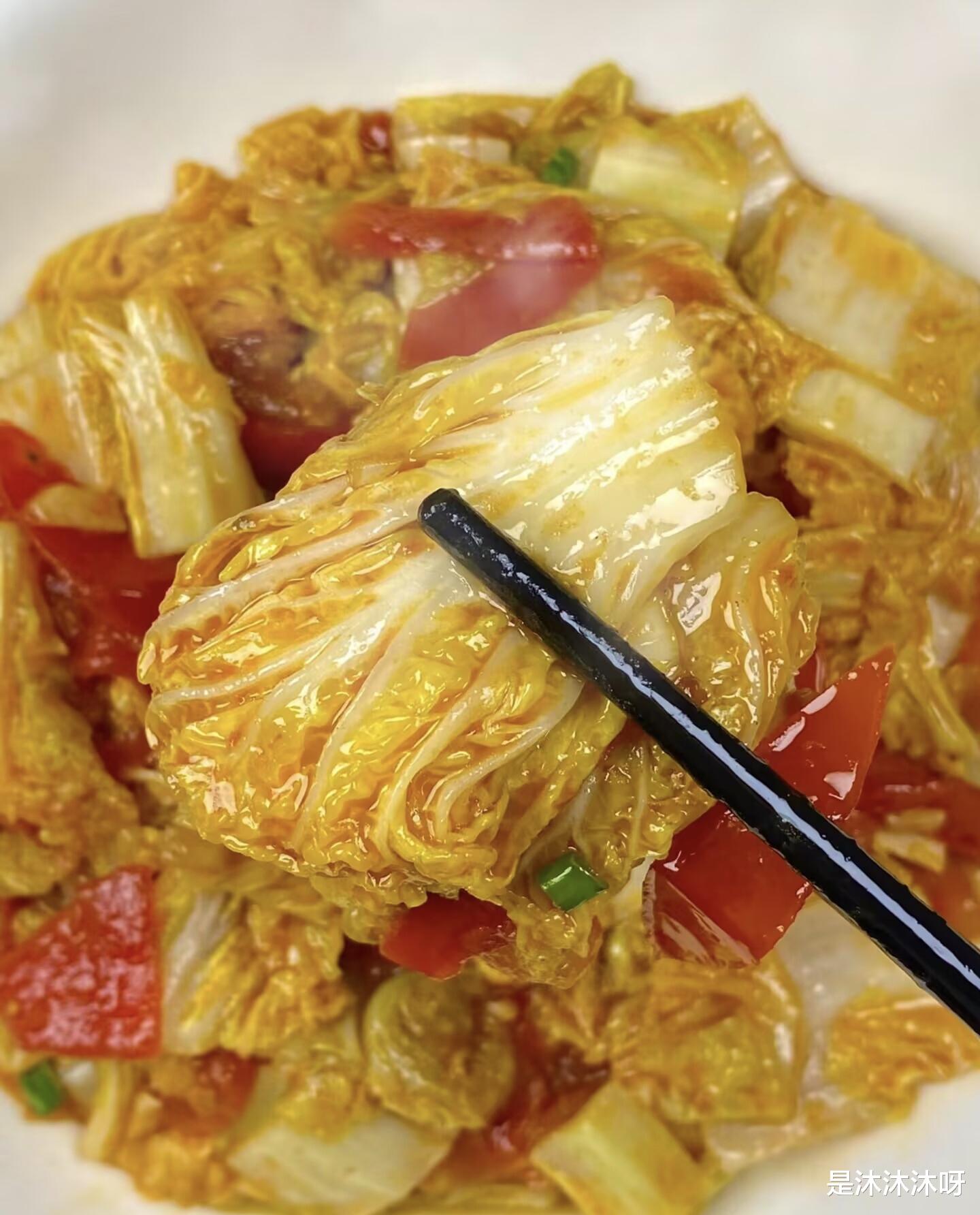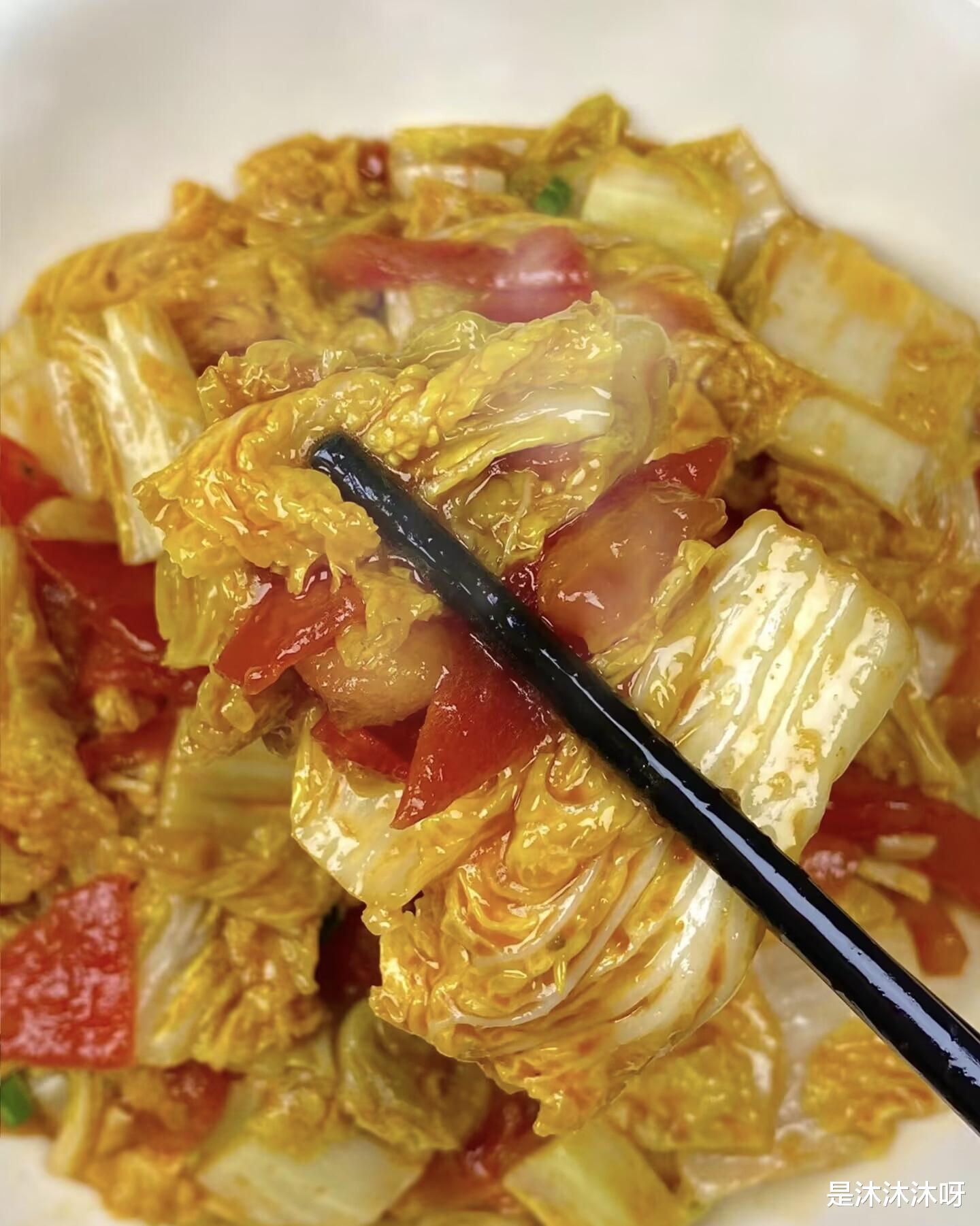 当番茄炒至软烂,汁水红亮时,便是娃娃菜登场的时候了。将切好的娃娃菜倒入锅中,与番茄汁水亲密接触。