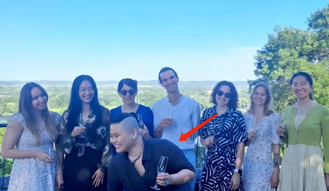 除了穿着独特之外,她身上还带着许多配饰,手中拿着酒杯,站在朋友之中笑得十分开心。