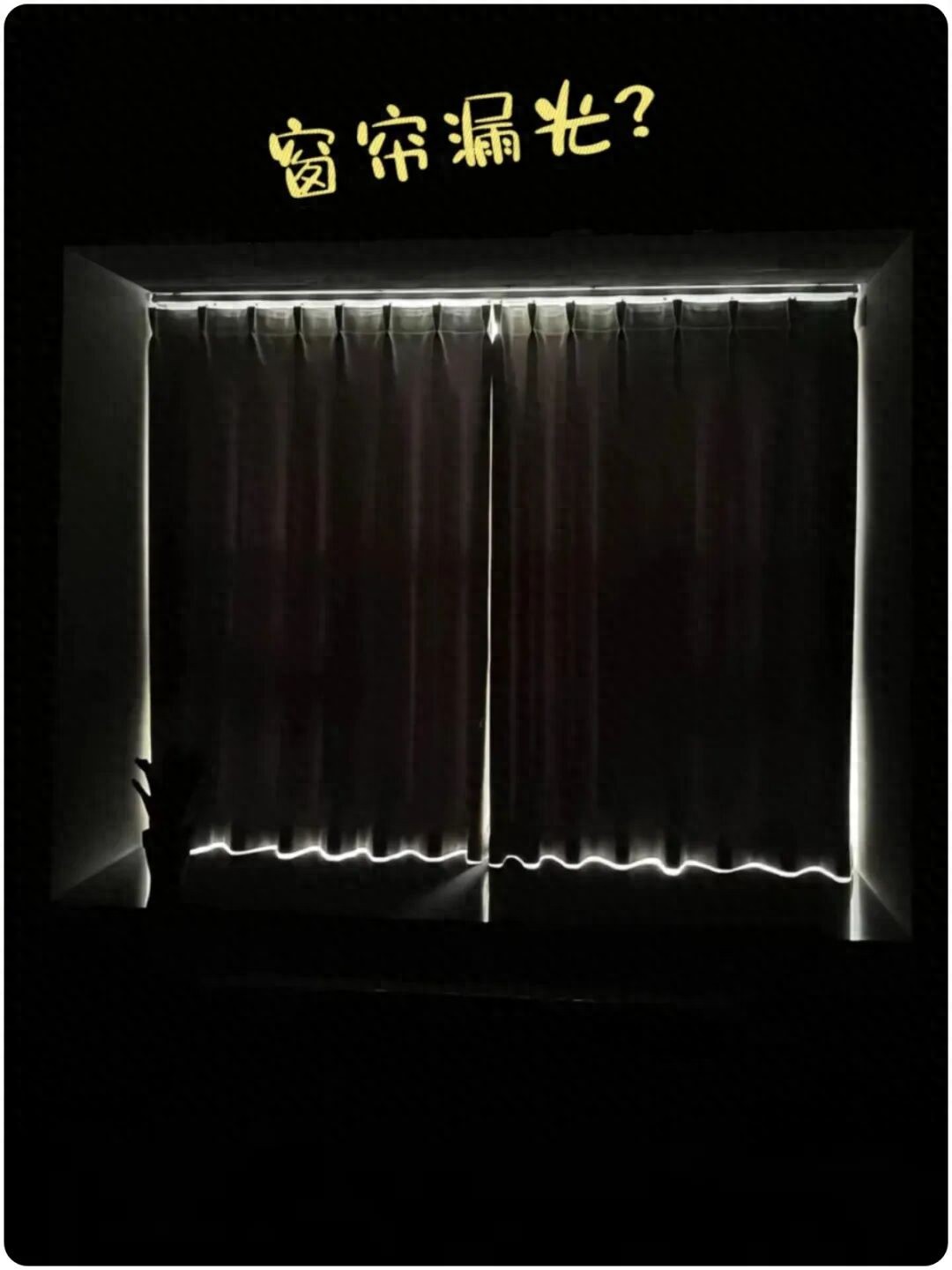 ▲窗帘漏光的原因很简单,尤其是飘窗窗帘,就是有缝隙,只需把缝隙堵上即可。窗帘有缝隙的地方就是4个:上、下、左右、中间开合处。