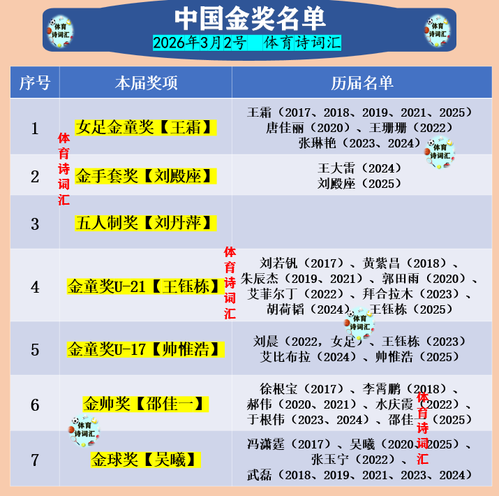 2026赛季已经随着超级杯的结束而开启,2025年中国足球各项颁奖典礼今天下午开启评选。中国五人制足球获得者是刘丹萍,其余奖项与历届名单如下。